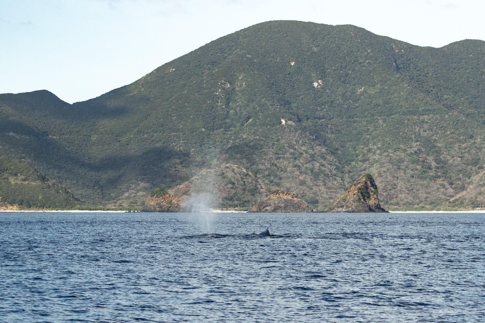 諦めて帰ろうかと、大島海峡の手前くらいまできたところで、またブロー。2頭と1頭が近くにいて、1頭にアプローチすると、なんと午前中のシンガーでした。